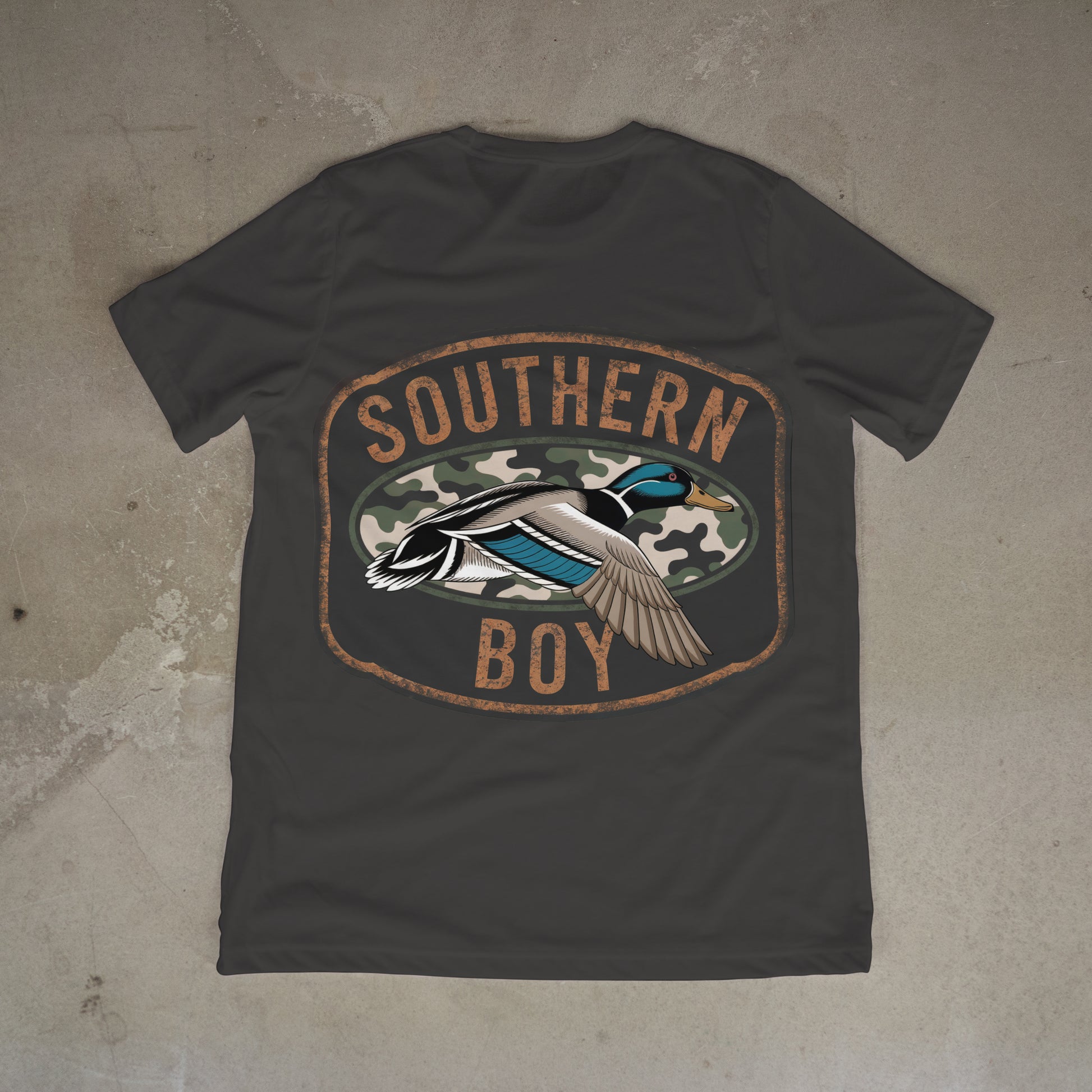 At the top of the badge, the phrase “SOUTHERN BOY” is proudly displayed in bold, distressed font, giving it a rugged, backwoods feel. The entire piece is wrapped in an oval frame, adding that vintage logo vibe perfect for shirts, decals, or gear.